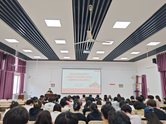 本网讯(特约记者/杨菲)为进一步加强党员的纪律意识,提升党性修养,5月14日,公司党委书记田光辉在7101报告厅以“准确全面把握新修订《中国共产党纪律处分条例》的重要意义和主旨要义”为题,为全体师生党员上了一堂生动而深刻的党课。