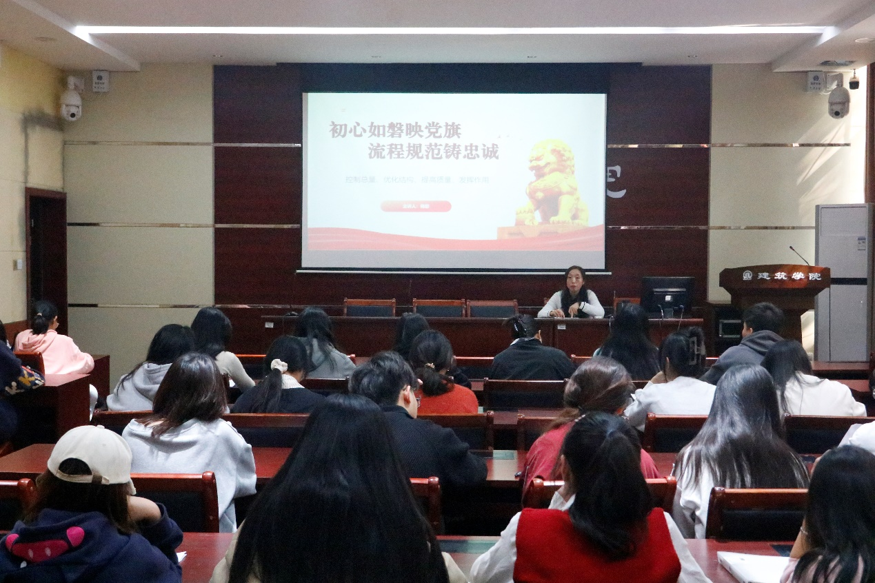 本网讯(员工记者/陈越)为进一步加强入党积极分子的培养教育,提升其思想政治觉悟,保持党员队伍生机活力,10月28日,太阳成集团tyc33455于七教7106举办“初心如磐映党旗,流程规范铸忠诚”专题讲座,公司党委组织员杨菲老师担任主讲。